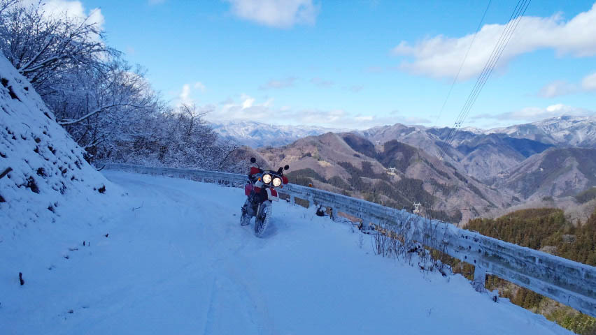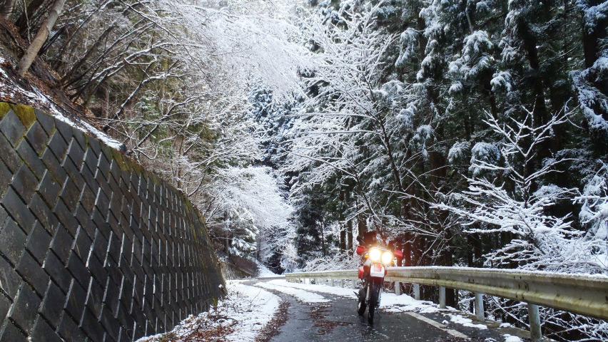 さっそく走り出してみると、最初のカーブを越える頃から、降り積もった雪で路面はその一面を白い姿に変えていた。