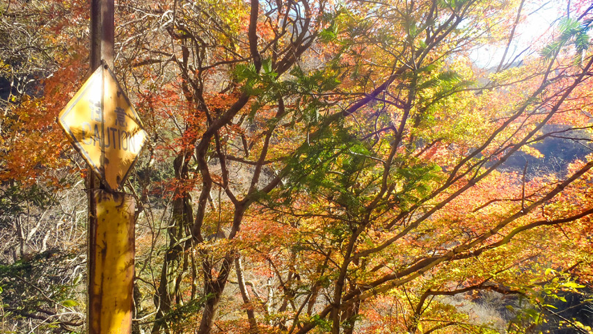 この辺りまで標高を下げてくると、場所によってはまだまだ紅葉も残っていて、明るい日差しを受けて眩しく輝く木々の葉と、日影の岩肌の中を流れ落ちる沢との対比がとても美しい。