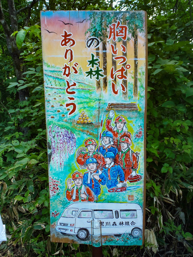 その地点には、こんな看板が立っていた。とても精細な絵が描かれたそれは、山火事注意の喚起などではなく、「胸いっぱいの森 ありがとう」という森への感謝を伝えるものだった。林道でここまでしっかりとした絵が描かれた看板も珍しいと思うけど、なんだかちょっと感動してしまった。
