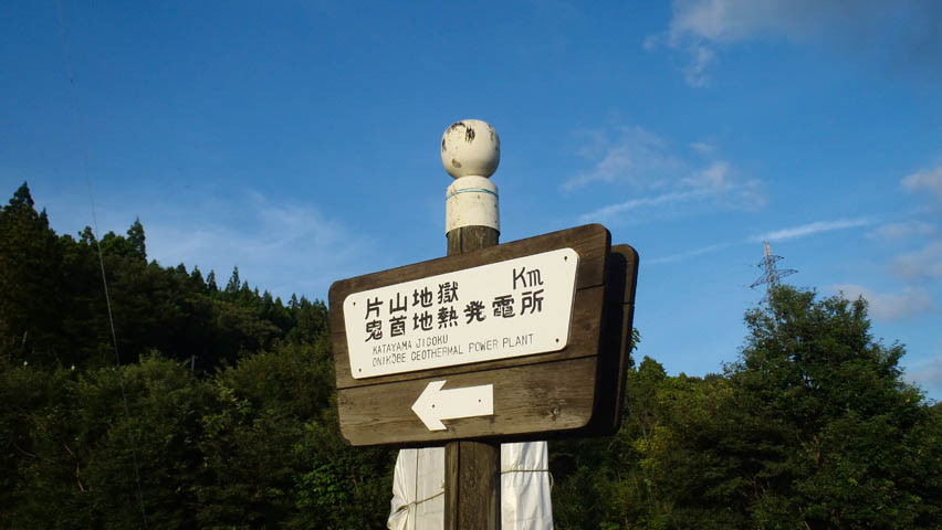 ツーリングマップルには「片山地獄林道」と記されている道だが、入口には「片山地獄 鬼首地熱発電所」と書かれた看板が立ち、他には林道の標識のようなものは見当たらない。