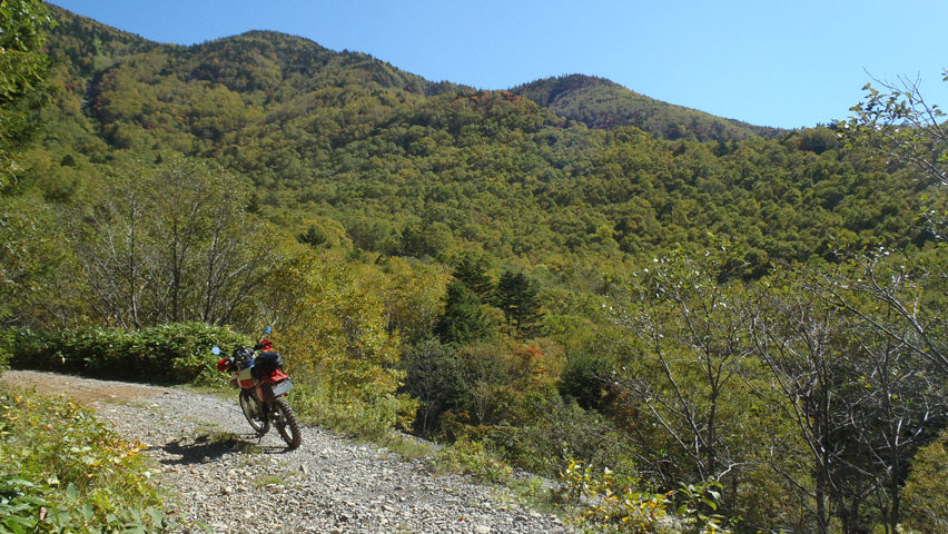 2度目の起点を過ぎて再びの舗装路を少し進み、道は改めてダートへ。10月に入ったとはいえ、まだまだ眩しく輝く緑を透かして降り注ぐ木漏れ日を浴び、夏の残滓を感じながら走っていく。