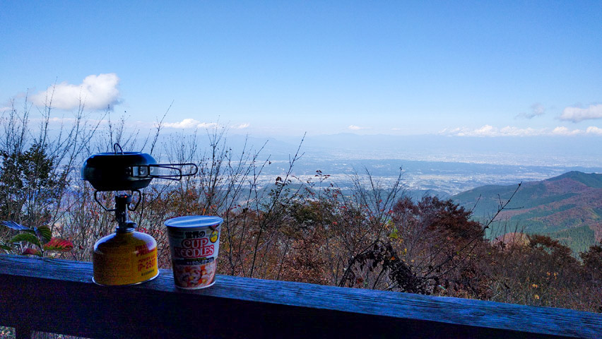 というわけで、今日も結局山の神の丘の展望台でお昼にすることにした。相変わらずここからの眺めは最高だけど、よくよく見ると左手の木の枝が以前よりも視界に掛かってきている気がする・・・。まあ、木も成長するから当然っちゃあ当然なんだけど、こういうのって剪定とかしてくれたりしないのかな?