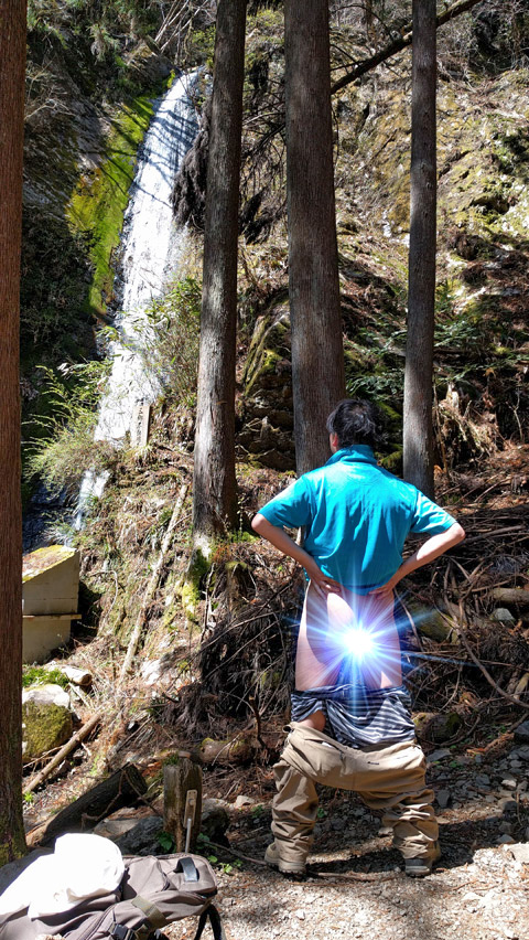 小天狗滝だ。そして滝といえばこの男の出番だ!さっそく滝壺へと突進するまあも隊長その人である!ちなみにまあもさん情報によればこの小天狗滝の落差は8mほどらしいが、聳える岸壁の中を流れ落ちる様は、その数字以上に威厳に満ちた姿をしている。