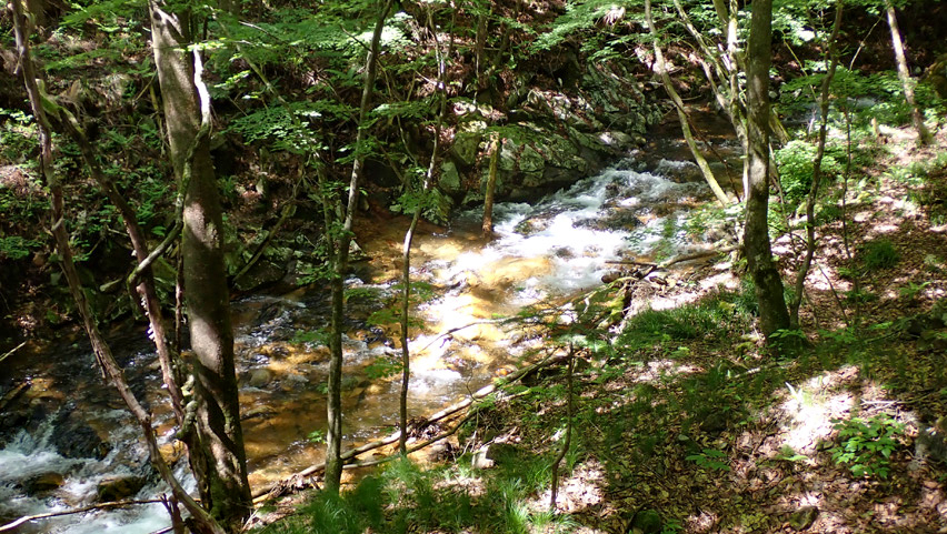 ここは、以前紅葉の時期に来た時に、周囲を彩る紅葉と沢の流れがとても印象的だった場所だが、こうして鮮やかな新緑に囲まれた景色も実に美しい。秋鹿の中でも特にフォトジェニックな地点だと思う。