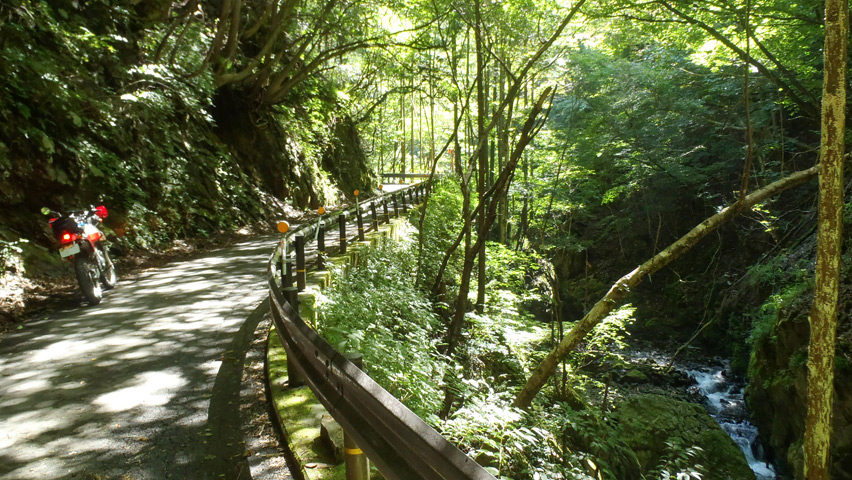 山肌に沿って延びるいくつものカーブを超えて、少しずつ高度を稼いでいく。晩夏の木々が苔生した路面に落とす木漏れ日が堪らんなあ・・・。