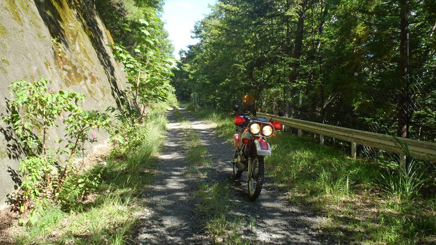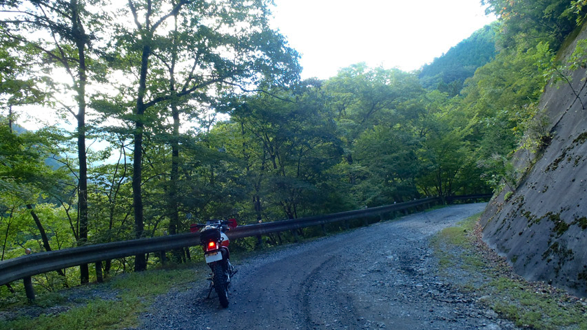 そんなコアラシ線も、気分よく走っているうちにあっという間にダートが終わった。ここで舗装の橋立林道に接続して少し下ると、本日最後の目的地に着く。