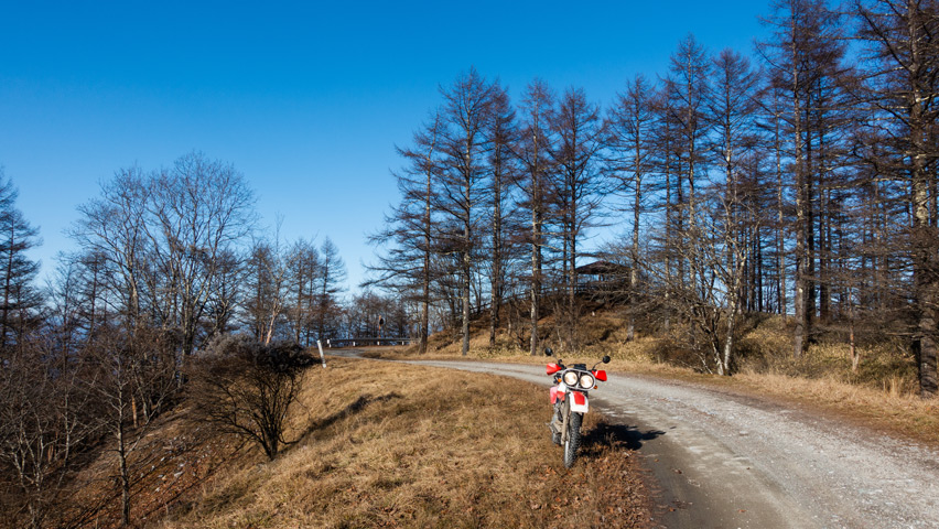 済んだ青空を背景に、毛細血管のように広がる剥き出しの木々の枝に包まれたこの景色を、とても美しいと感じる。やはり林道は、どの季節に走っても、その季節ごとにそれぞれ違った美しさがあって、だから季節を変えて何度でも走りたくなってしまう。