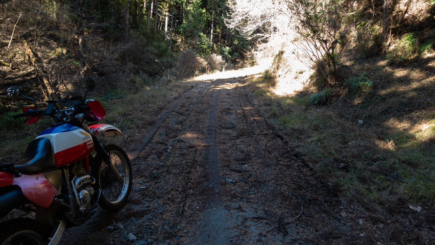 そして、薄暗い杉林を抜けてくると、明るい日差しを浴びて、山側に生える木々が道に迫るように枝を伸ばし、路上はその落ち葉が一面を覆っている地点に出る。この景色がなぜかとても印象に残っていて、こんなマイナー林道だけど、冬になるとわりとよく思い出す景色なのだ。