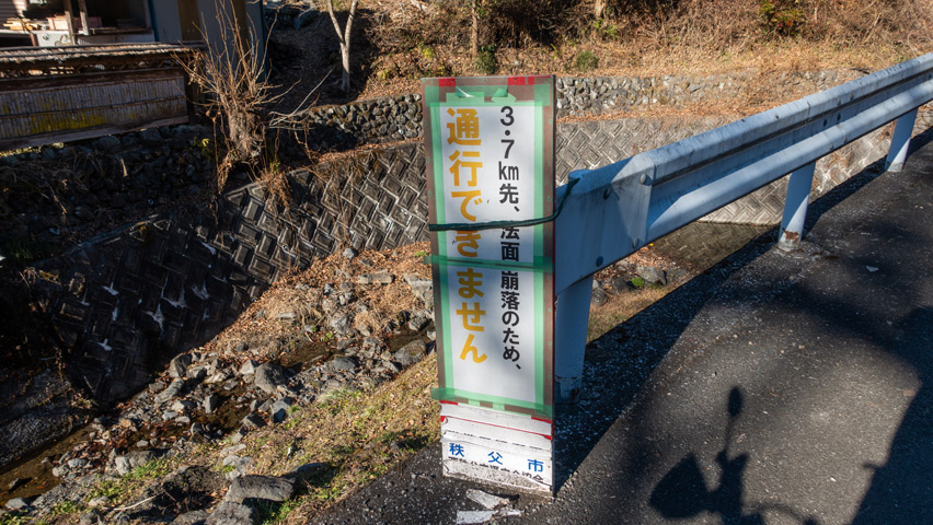 そしてその少し手前には、ここから3.7km先で法面崩落のため通行ができないとの看板があった。これはつまり・・・その崩落地点までは通行できるということだよな?