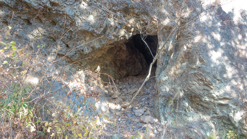 舗装区間を少し進んでいくと、法面に大きな穴の開いた地点がある。