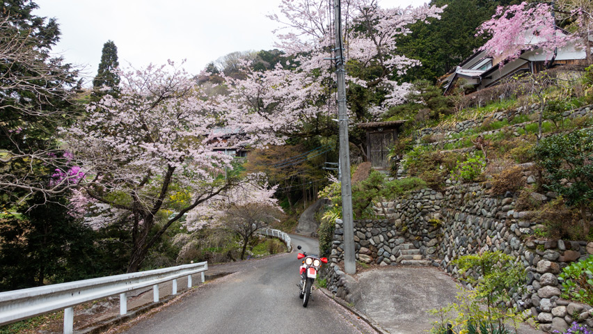 で、桜の下で数枚撮ってまたダッシュで引き返してくると、その後から1台のバイクが上がってきた。なんと、ツイッターでお世話になっているKawaiさんでした。BAJAを見て気づいてくれたらしい。俺も下で赤いバイクが見えて、もしかして?とは思ったんだけど、桜の下で人が途切れたタイミングで写真を撮ることに必死になりすぎてしまった(笑)。