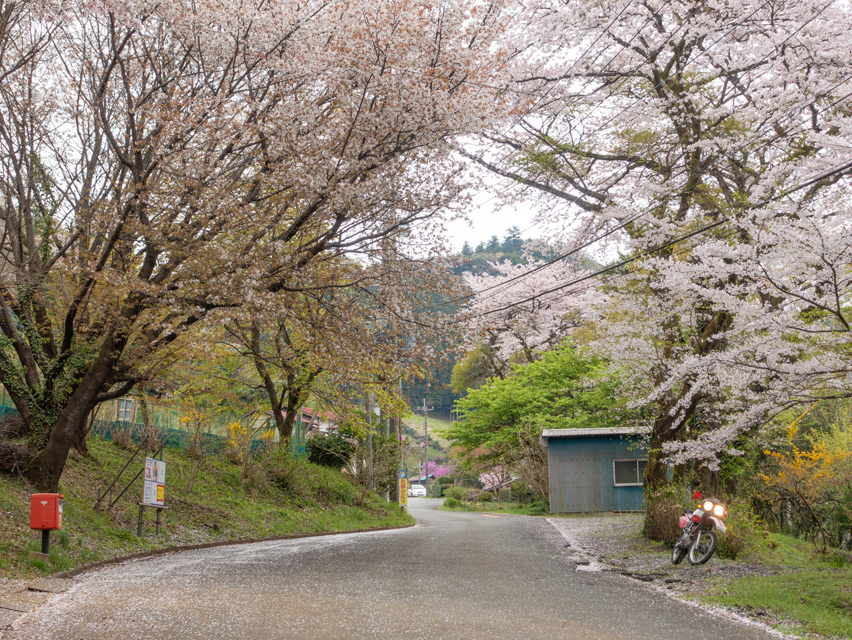 まずやって来たのは、鎌北湖を少し下ったところにある桜並木。ここは距離はごく短いものの、満開の時にくるととても綺麗なのだが、今日は生憎の空模様のうえ、開花のピークはすでに過ぎてしまっていた。