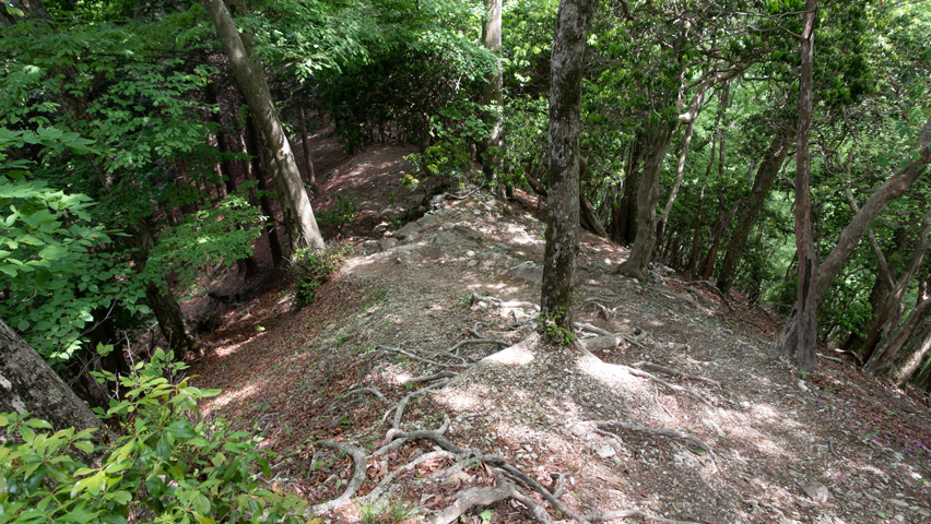 その先で、妻坂峠までの下りの中で最もスパルタンだと思われる区間に突入した!真ん中に薄っすら道筋が見えるかと思うが、その周囲に生える木々の角度で、ここがどれだけの急勾配か伝わるだろうか・・・。