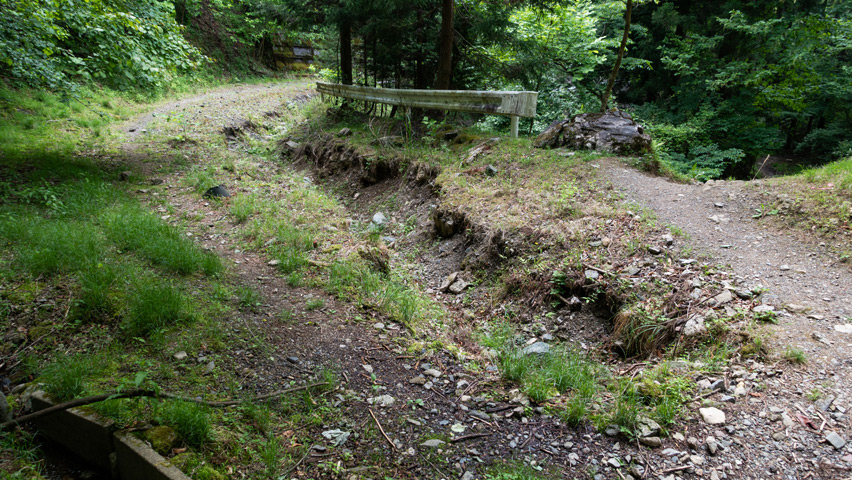登山道との交差地点から少し下ると、先ほどの洗堀があっという間に幅を広げ、路面の半分が失われていた。うおお・・・なんということだ!