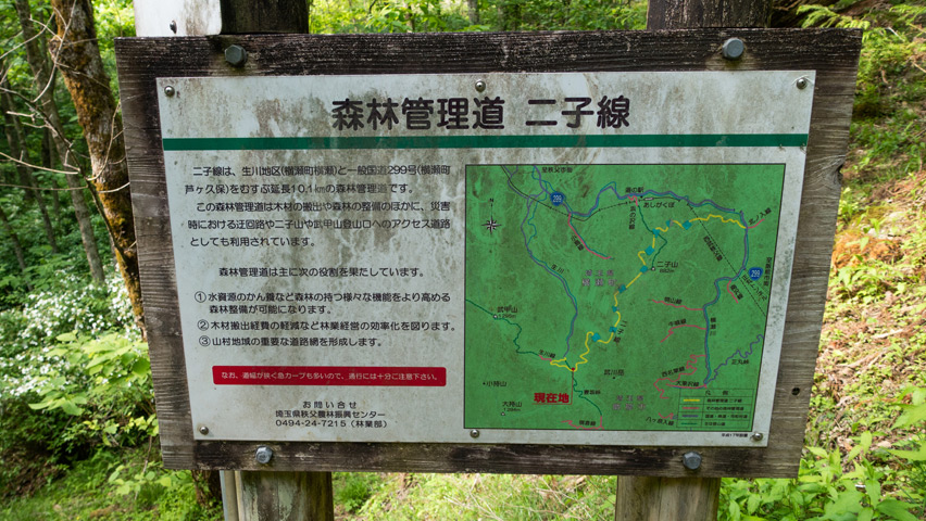 そして、二子線側の路肩には、こちら側が二子線であることを示す標識(起点はここよりさらに下った一の鳥居の前)と、森林管理道開設中の看板が立てられているが、その「開設中」の文字も、いまはただ虚しいばかりだ・・・。