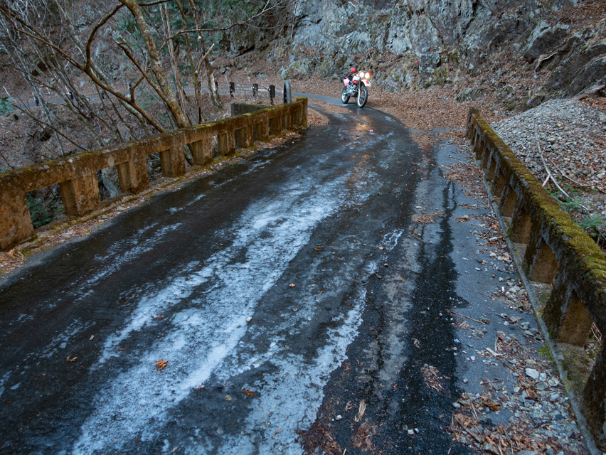そう思って、念のため歩いて進んでいくと、橋を渡りきったところで氷が路上を横切って進路を塞いでしまっていた。氷を越えるまでの距離はほんの僅かなのだが、下りならともかく、上り勾配でのこの状態を無事に通過できる自身は俺には無いッ!