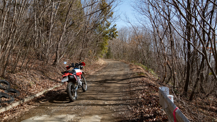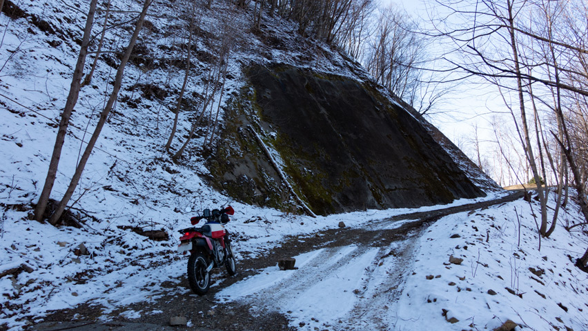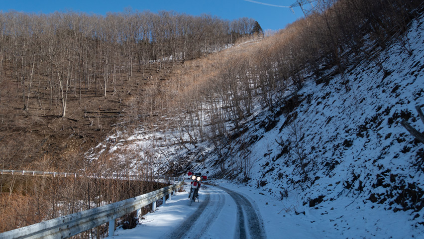 先に来ていた4駆のグループも去り、ここでひとり、だいぶのんびりとしたランチタイムを過ごしたが、そろそろ発つとしようか。さっき、その4駆の人に聞いたところ、この先の高荻線方面にはもうほとんど雪は無いそうで、ここからでも、この先に下っていく路面はすっかりドライになっている様子が見えた。