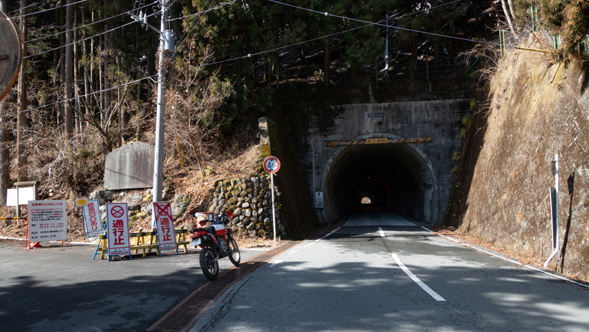 トンネルを抜けてすぐの地点には、車線を半分ほど塞ぐ程度の小さなバリケードと、その手前に立て看板が置かれていた。