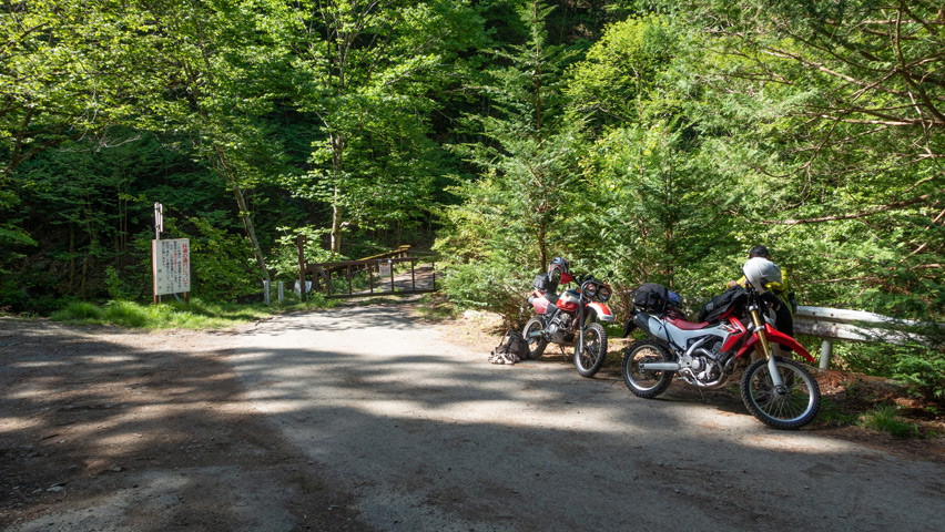 というわけで、現在時刻 8:50。ゲート前にバイクを停め、ここから先は歩いて雲取線を辿っていく。BAJA君とあけみちゃん、ちょっと・・・ではないな、今日一日ここで待っててね。