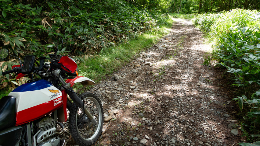 その第2起点から少しのあいだ続く舗装路は、雨量が多かったときなどは路面が川のようになっていることもあるが、今日はこれといった問題もなく、やがてダート区間に至る。