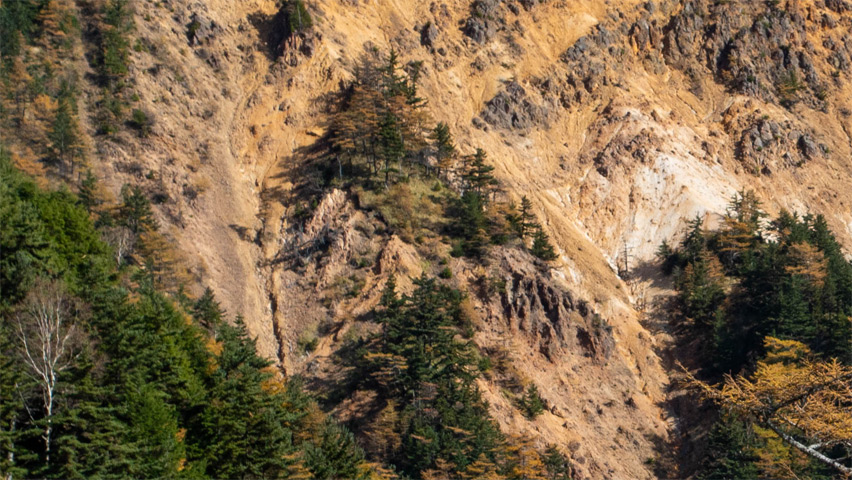 振り返ればこの迫力!穏やかな路面と、そこに似つかわしくない剥き出しの山肌、そして鮮やかな黄葉のカラマツ。全てが完璧に組み合わさっている・・・素晴らしすぎる!