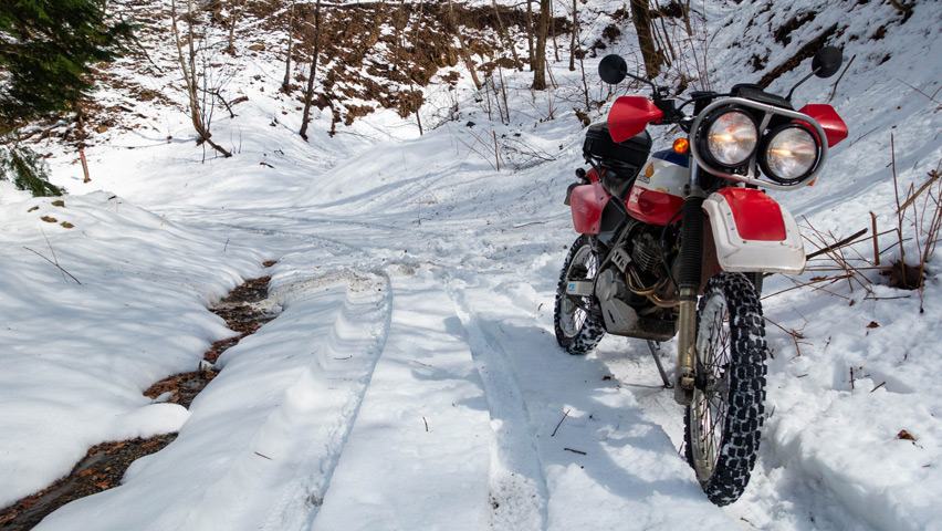 ・・・ただ、実は今現在、BAJAのタイヤのブロックが、もう交換直前程度には擦り減っていて、そんな状態なもんだから雪面を進むのもそれはそれで難儀した(それはもうブロックタイヤとは言わんのよ)。