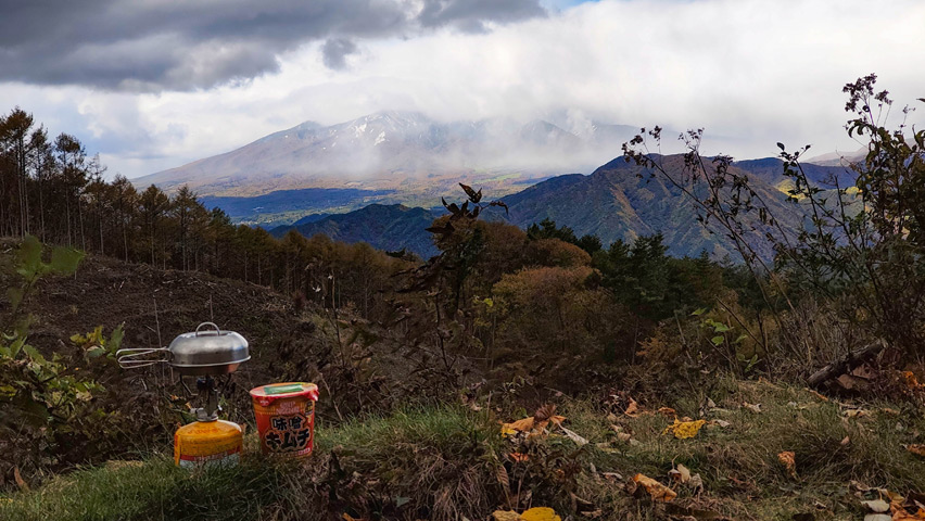 それでも、そろそろ腹も減って来たので、ここで飯にするんだぜ。ここにいるあいだずっと雲は空を覆ったままだったけど、時折風に流されてうっすらと天狗岳が見えると、雲の隙間から差す光に照らされたその姿がとても美しかった。