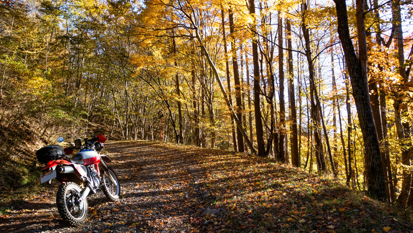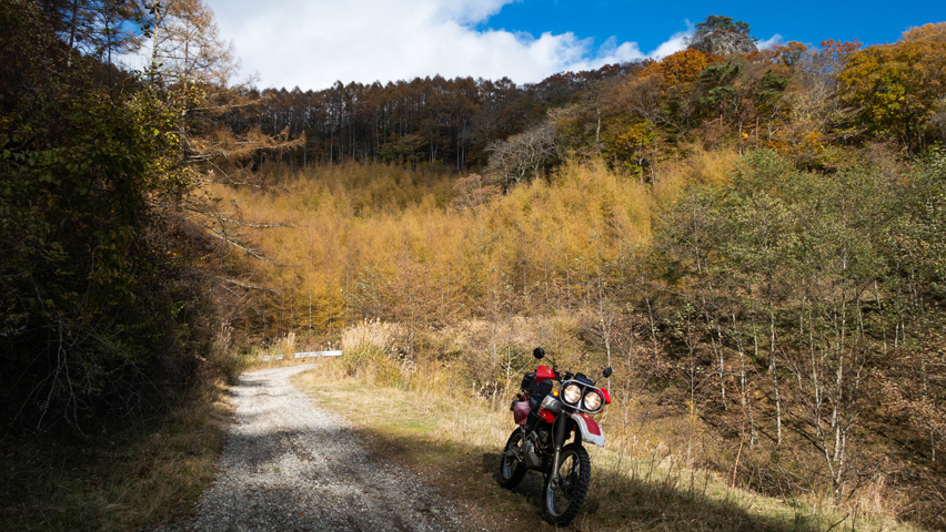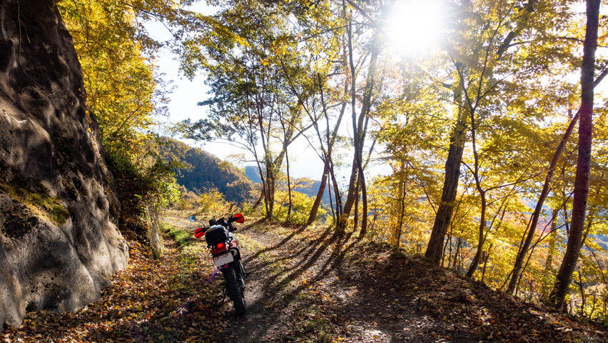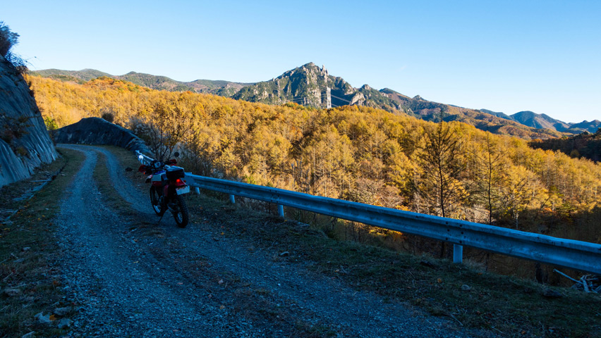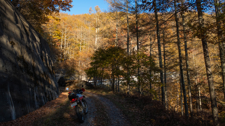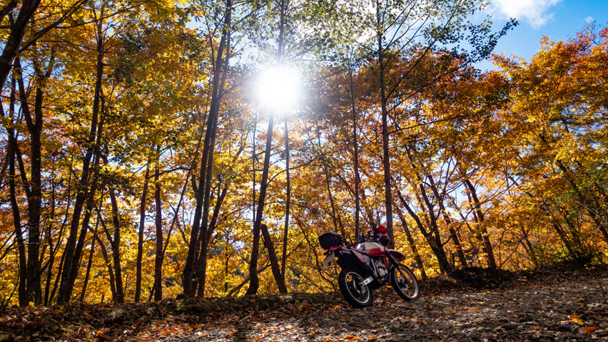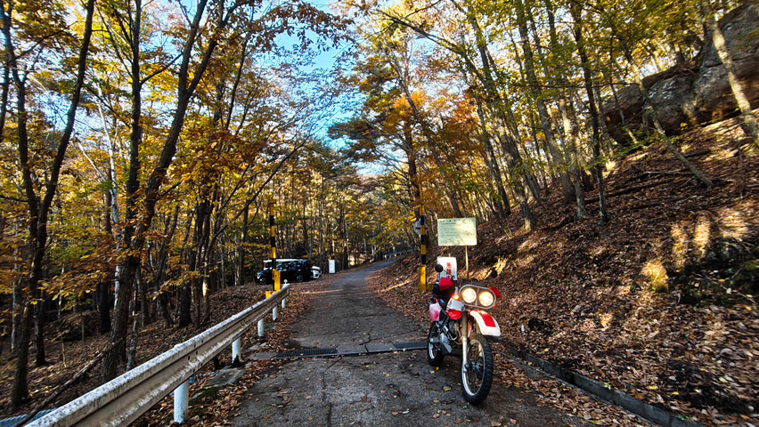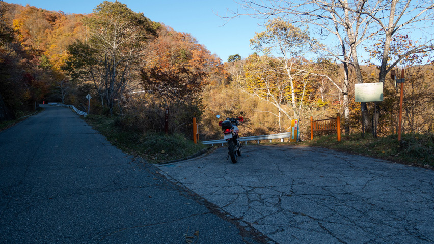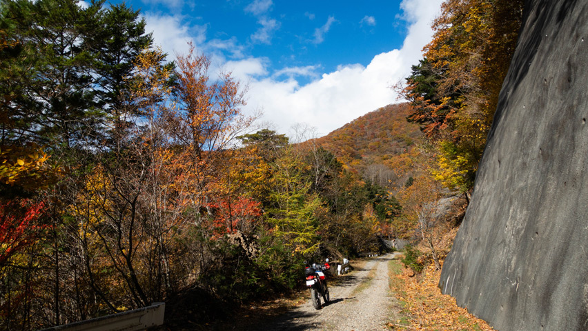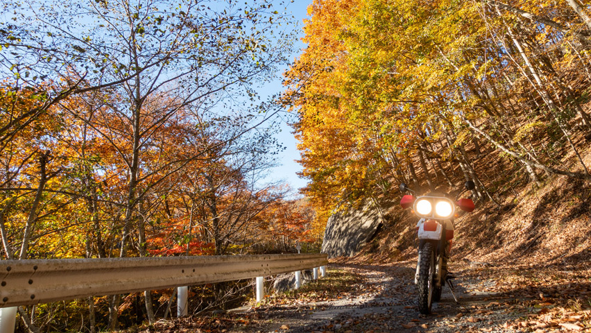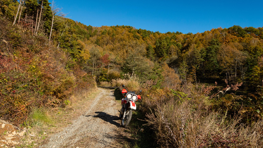 最高だ・・・金ヶ岳線からさらに北上したおかげで紅葉の色づきも今日一鮮やかで、秋の林道を走る喜びってこれだよなあ、と改めて実感しながらのんびりと路面を踏みしめる。