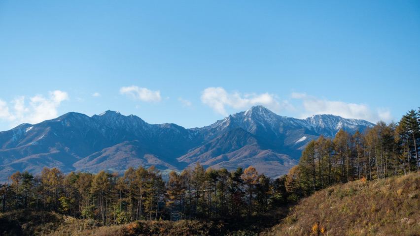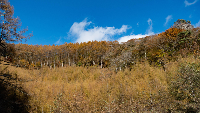 ここでも背後を振り返ると、斜面にカラマツ林が広がっている。カラマツの黄葉は、秋の林道で見られる景色のなかでも特に好きなもののひとつだが、今年もこうしてこの景色の中に佇んでいられることが本当に嬉しい。
