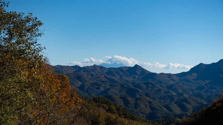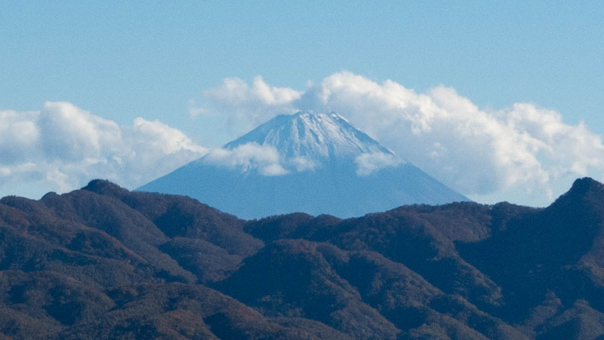 富士山だ!山頂付近を薄っすらと雪化粧した富士山が雲の切れ間からその姿を現した!そういえば、以前ここで足を止めたのも、あの富士山の姿を見るためだったような気がする。あのときは夏の蒸し暑い空気で、見渡す山々も霞んで薄青のシルエットになっていたけど、今日はこんなにもくっきりとその姿を見せてくれた。
