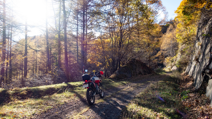路上に落ちる木々の影の中を走っていくと、その光と影がチカチカと明滅し網膜を撫でていく。これもこの季節の林道の楽しさだ。