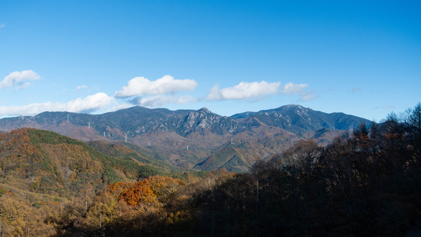剥き出しの岩肌が突き出す山と、その手前で山々を渡っていく送電鉄塔がとても印象的な景色だが、あれは何という山だろう。AR山ナビ使えば良かった・・・(笑)。